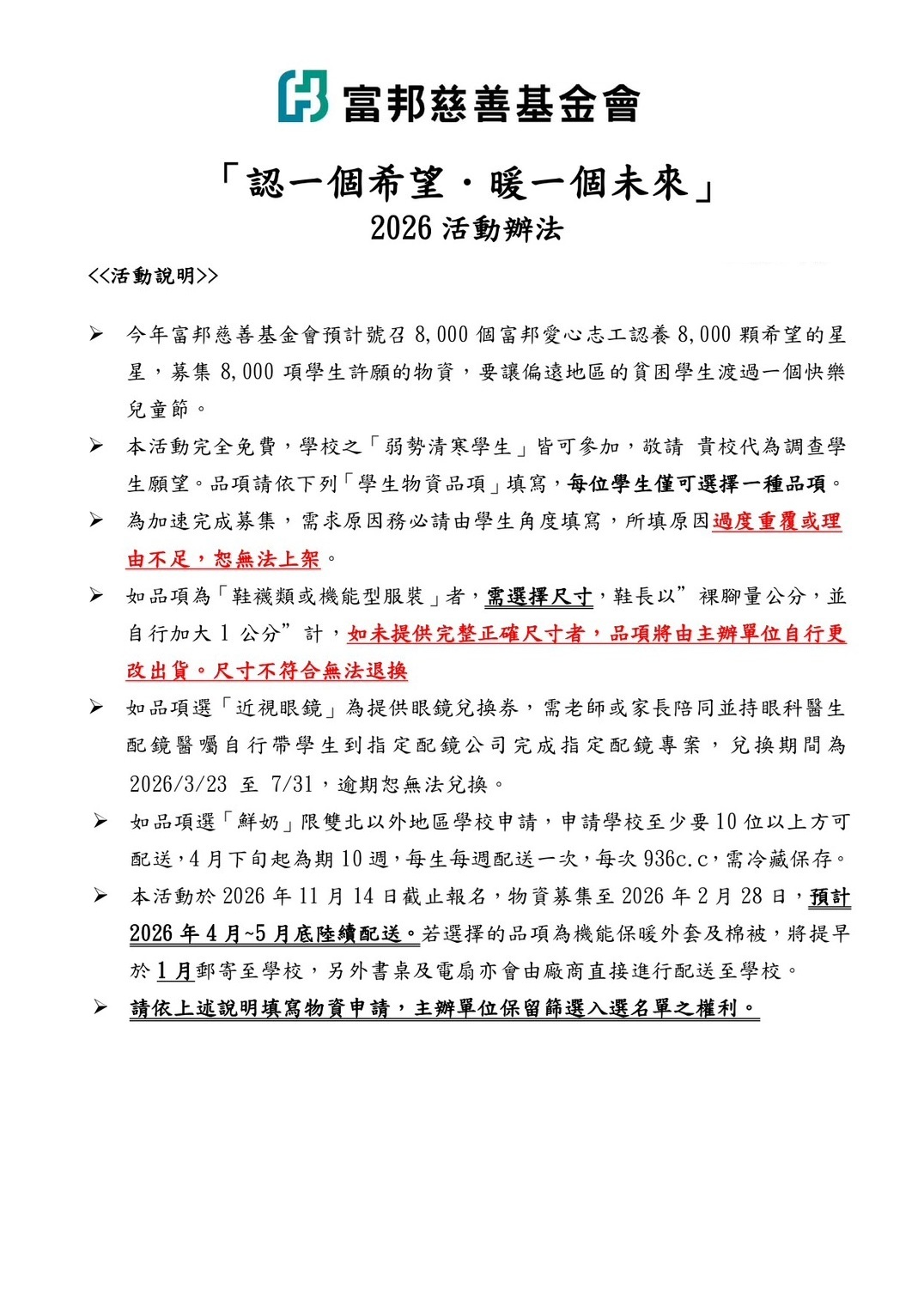 【轉知】富邦慈善基金會-「認一個希望.暖一個未來」2026活動