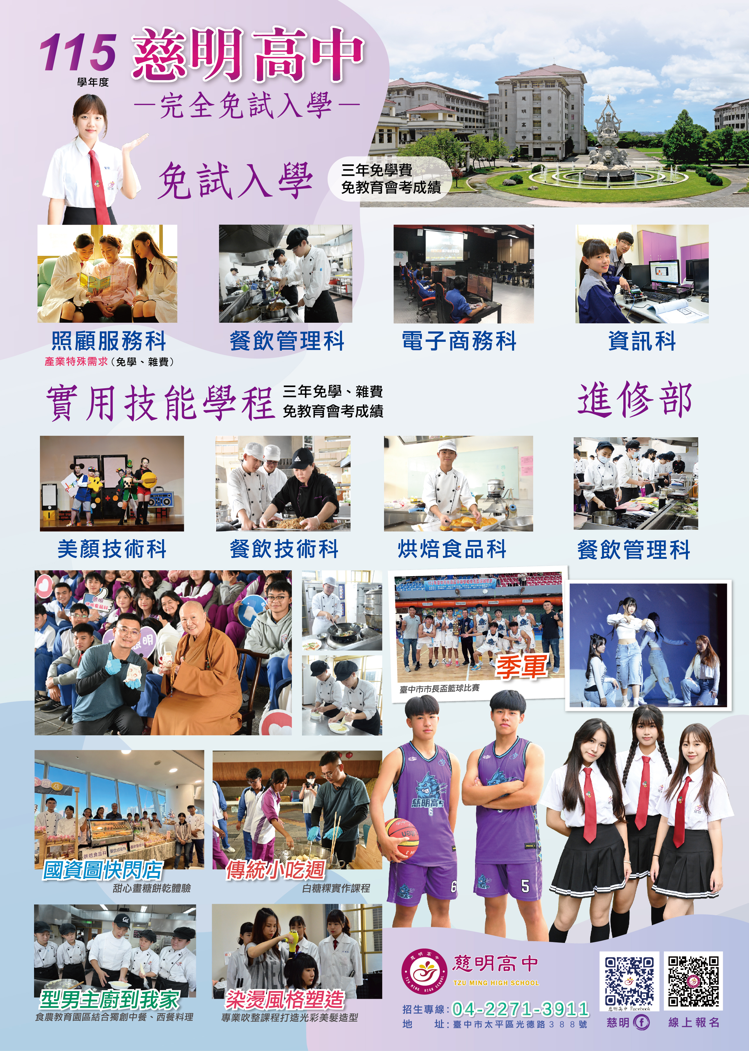 【轉知】臺中市慈明高級中等學校『115學年度建教合作專班』
