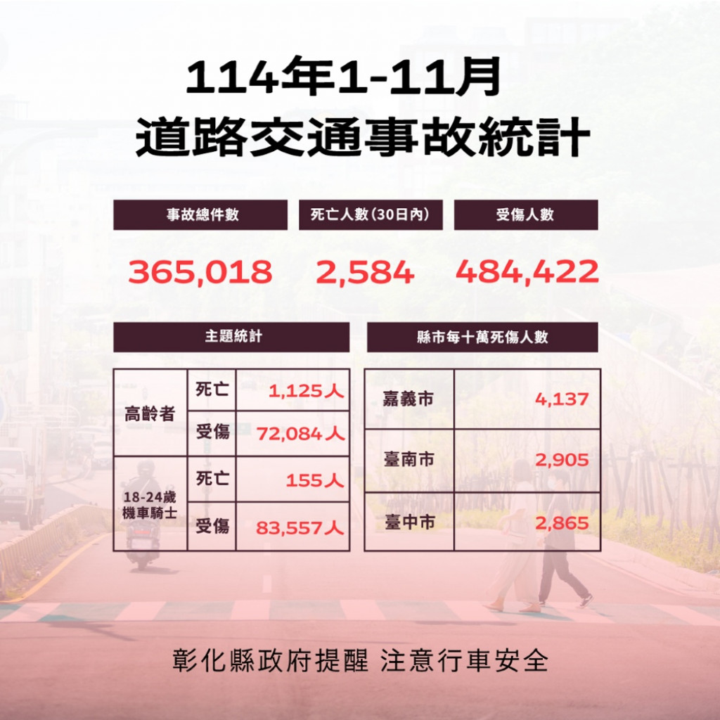 根據交通部道安資訊查詢網,本縣114年1-11月道路交通事故與112年同期比較分析,以少年自行車騎士(含電自、電輔) 事故增加46.9%最高,動力機械案件增加28.6%次之,外籍人士事故增加24.6%再次之。1-11月份鄉鎮市30日死亡人數於「彰化市、員林市、鹿港鎮」為多,肇事熱點以「彰化市」為多,合先敘明。 |
