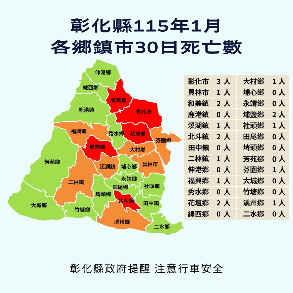 根據交通部道安資訊查詢網,本縣115年1月道路交通事故與去(114)年同期比較分析,以大型車造成行人涉入事故增加100%最高,少年自行車騎士(含電自、電輔) 增加67.4 %次之。微型電動二輪車(含電輔) 增加48.8 %再次之。1月份鄉鎮市30日死亡人數於「彰化市、和美鎮、北斗鎮、花壇鄉、埔鹽鄉」為多,肇事熱點以「彰化市」為多,合先敘明。 |