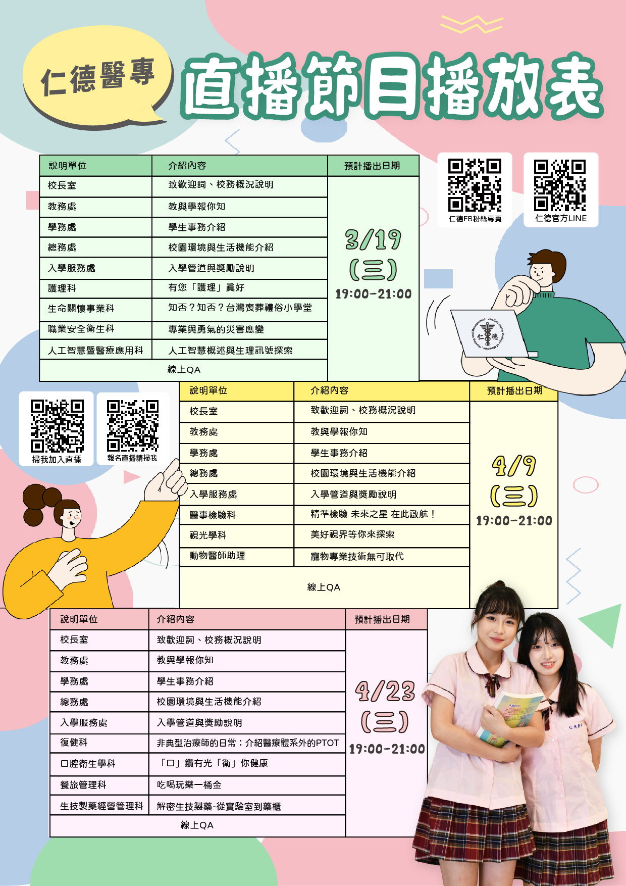 【轉知】仁德醫護管理專科學校辦理「114學年度五專免試入學及公費生制度線上說明會」資訊